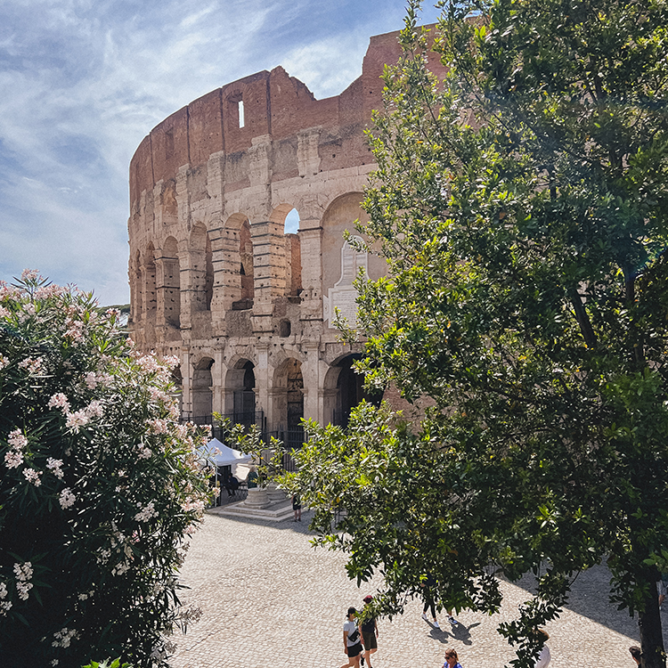 이탈리아 로마의 콜로세움과 큰 나무, 협죽도 나무가 함께 있는 풍경을 담았습니다.